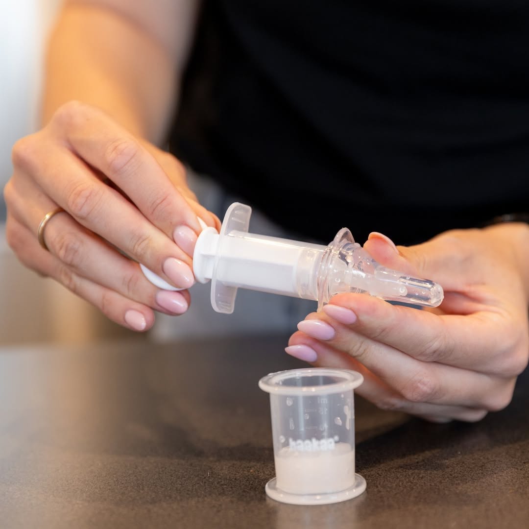 ***Haakaa špric mjeri tečnost u jedinicama od po 5ml pa u slučaju davanja manjih doza preporučujemo da precizno izmjerite prije aspiracije u meki, silikonski špric za davanje lijekova.