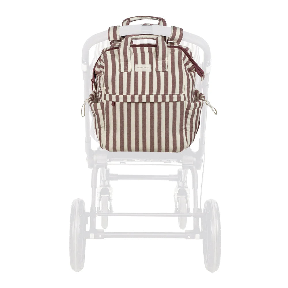 Ruksak za kolica Cherry Stripes iz Pasito a Pasito Cherry kolekcije savršen je za roditelje koji žele spoj funkcionalnosti i stila — ruksak koji istovremeno služi kao torba za presvlačenje i kao praktičan ruksak za kolica.