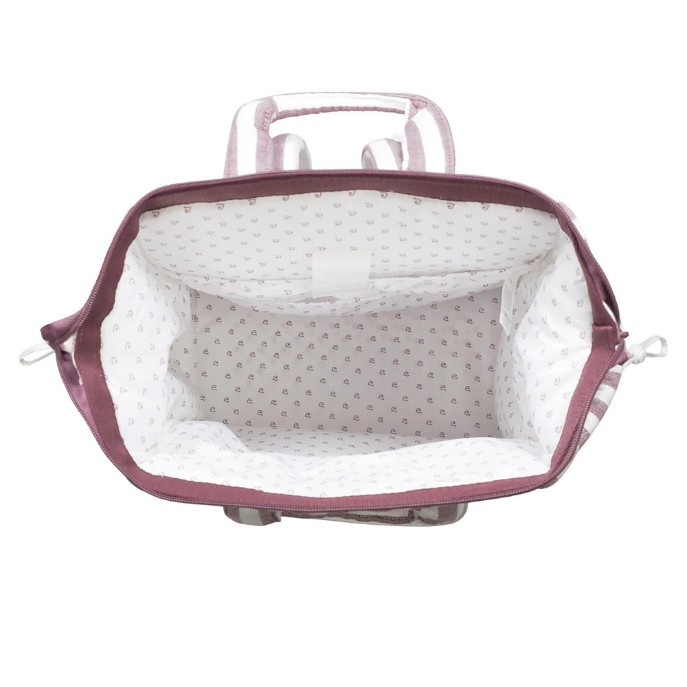 Dizajniran je s prugama u nijansi „Cherry“ koje mu daju svjež, moderan i upečatljiv izgled. Oblik ruksaka omogućava da sve potrepštine — pelene, maramice, bočice, rezervna odjeća — budu uredno organizovane i lako dostupne.